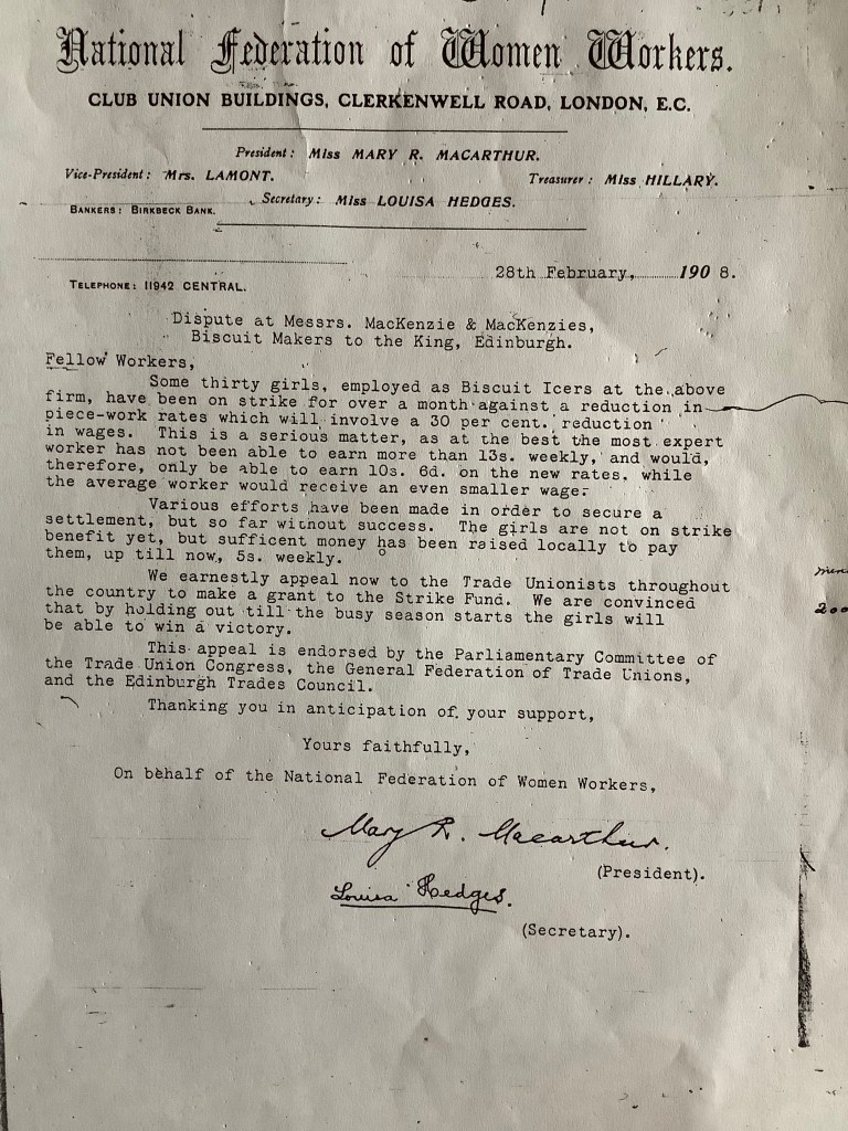 As I sat at my desk in the afternoon with a cup of tea, reading the news (there you go, I was already distracted from the work I was supposed to be doing) about potential strike action by GMB members at Burton’s Biscuits in Edinburgh, a piece of paper fell off my ‘filing’ pile and fluttered to the floor. Stooping to retrieve it, I saw that it was an appeal for funds to sustain 30 women employed by MacKenzie & MacKenzies’ Biscuit Makers in Edinburgh in 1908. Wondering by now what year I was actually in was enough to get me off my chair and start digging around in folders of research notes that go back years. This is the result.