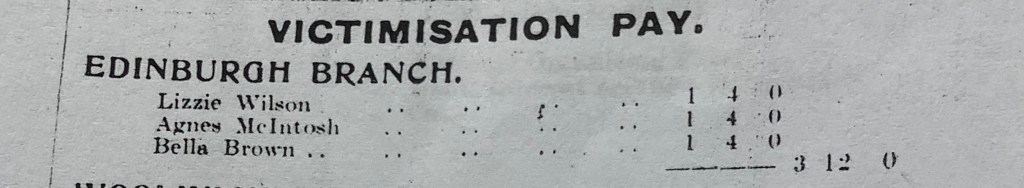 The financial and moral support kept the women out on strike into the Spring. The Trades Council praised their spirit of comradeship and recorded with pride that despite its length, the strike had remained solid. Several attempts to negotiate with MacKenzie & MacKenzies were made but the firm remained adamant that its proposals would not mean wage reductions for its employees. Even threats to raise the question in Parliament or to kick up a national stink about the behaviour of the Royal biscuit making establishment did nothing to lead to a change of heart. By June, according to Edinburgh Trades Council, the fund was helping just four of the strikers because all others had found work elsewhere. There was at least pride in the fact that none of the women had returned to MacKenzie and MacKenzies. The NFWW’s Annual Report for 1908 recorded that year as a trying one for the Edinburgh branch (there was another – more successful – strike, this time at a paper bag factory) but nonetheless it had managed to increase its membership overall. In the next few years, with the help of some brilliant women activists and with the continued support of the Trades Council, the branch strengthened and grew. Such progress, however, could never be taken for granted. The NFWW did all that it could do protect its members from employers who intimidated, threatened or sacked those regarded as ringleaders and troublemakers. Its 1908 Annual Report shows that during that year three members of the Edinburgh branch received victimisation pay of £1 and 4 shillings each, presumably to compensate for loss of earnings.