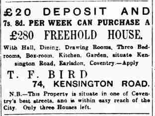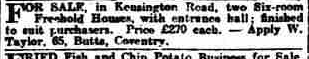 Another at number 8 Kensington Road offered sole occupancy of a bedroom, a shared sitting room and a bath. Prices were not generally advertised, as the terms of residence were for private negotiation; some lodgers requested an evening meal whereas others would eat at the works canteen and opt for a more self-contained arrangement (the provision of meals and services was what usually distinguished a boarder from a lodger), perhaps needing only to share the family kitchen to make tea or light suppers. Boarders and lodgers alike added considerably to the laundry load and to housework tasks and of course there was the loss of family privacy – a stranger at the table for Sunday dinner, perhaps. There was the inconvenience of another person using the WC and washing facilities, the need for more hot water and heat. Kensington Road boarders and lodgers were overwhelmingly male and in Kensington Road the very few women lodging included a dressmaker, a nurse, a piano teacher and an elementary school teacher (living in a household where the daughter was also a teacher). Suitable lodgings for women workers were difficult to find during these years and there were public meetings organised by concerned campaigners to establish all-female lodgings where women could feel safe and secure. This was put forward as a moral as well as a practical issue (it being declared a ‘disgrace’ that Coventry had nowhere where women could seek lodgings other than newspaper columns and shop noticeboards), for the need to preserve women’s modesty and privacy in mixed sex boarding houses or households troubled many who sought to improve the lives of young and single women workers. When young women could no longer live with their families or had left their home towns in search of work, what they needed was to see advertisements like this one, for ‘superior apartments for one or two young ladies: board optional. No other boarders kept’. They still of course had to take the meaning of ‘superior’ on trust.