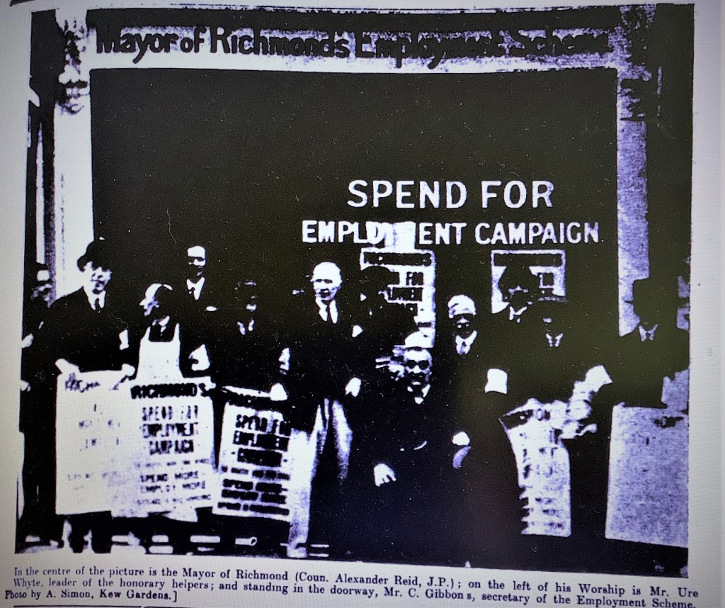 The model chosen by Richmond was the so-called Bristol Scheme, established by the Bristol Rotary Club in 1932 to encourage citizens to ‘spend that others may earn’. This – or variants of it – was established – or at least tried – in the spring of 1933 in over a hundred locations across Britain, from large cities including Edinburgh, Sheffield and Birmingham to towns such as Stockport and Winchester and several London boroughs. In Richmond the intention was to obtain £30,000 worth of promises and by April, the local newspaper reported that it had succeeded in bringing in pledges and donations totalling £40,000. How much work was found is unknown, but a scheme run in nearby Barnes and Mortlake, claimed, at the conclusion of its scheme, to have secured full time employment for 150 men and additionally some obtained casual work. It was no cure for unemployment and across the country only small successes were claimed but those who championed it believed that one of its biggest advantages was the encouragement given to local people to come face to face with the problems of unemployment and think seriously and deeply about its causes and effects.