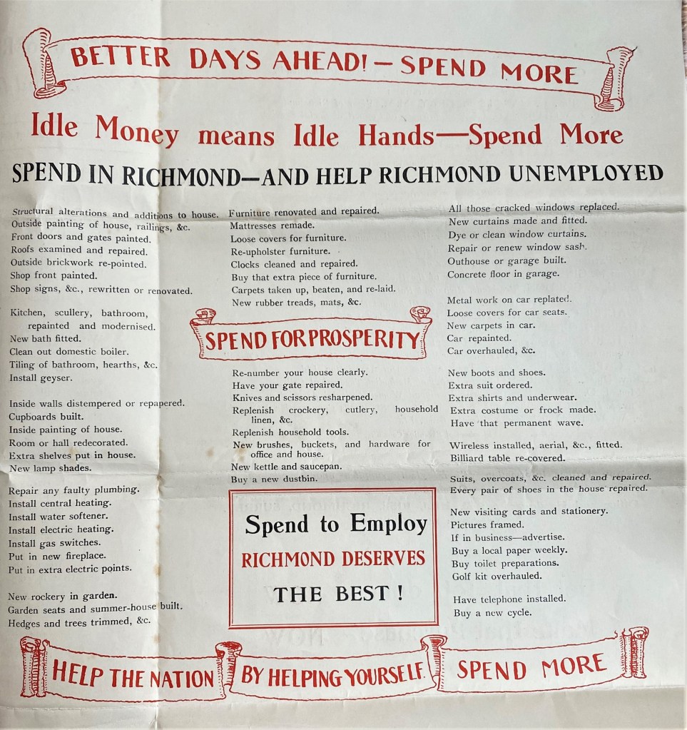 Distinct from money set aside by the Borough Council for public works, those involved in setting up the new scheme were at pains to stress that the venture was not funded by rate payers but was wholly dependent on private expenditure. Richmond citizens were asked to fill out pledge cards, promising to spend money during February, March and April – recognised as the slackest months of the year – of 1933 which would lead to chances of work for local unemployed workers. Rather than saving for a rainy day, those with available money were asked to spend it locally and provide work for tradesmen and businesses, by committing to having work done that was beyond the strictly essential. Leaflets, promises cards and appeal letters were distributed to all Richmond households by an army of volunteers, all supplied with specially designed armbands.